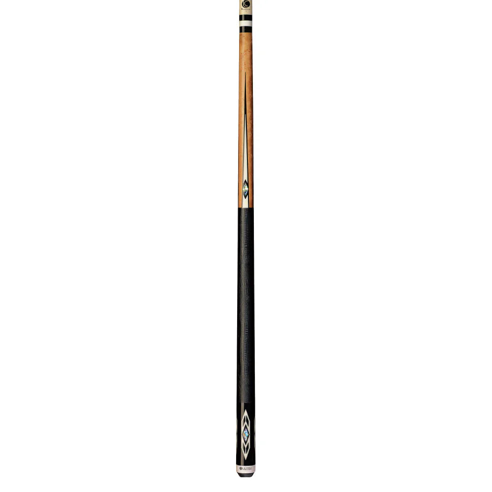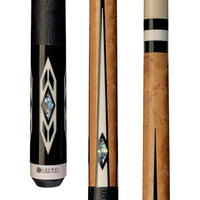 This classically-styled Lucasi Custom cue features an antique-stained Birdseye Maple forearm and mystic black butt with four-point imitation bone, black & abalone inlays, black lizard print embossed leather wrap, slimline white Implex butt cap, quick-release Uni-loc joint, and Zero Flexpoint Solid Core Low Deflection Technology Shaft.