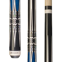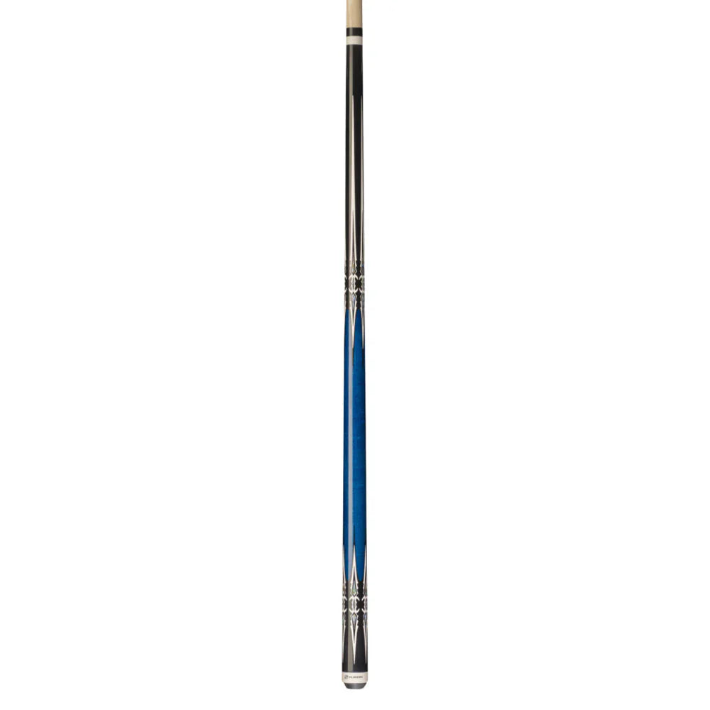 Cobalt blue stained Birds-eye Maple forearm and butt sleeve with double sided dagger mother-of-pearl overlays, black & white Implex joint collar, and sleek white wrapless handle. Lifetime Guarantee even against warpage Made from 100% North American Grade A Hard Rock Maple Wrapless handle for a better slip stroke.