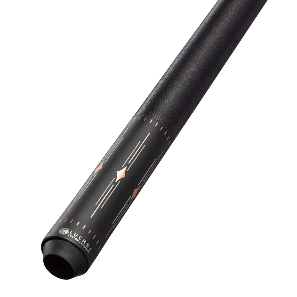 Inform when this item available Lucasi Hybrid Matte Grey Wash/Charcoal Birdseye & White/Rose Gold Inlays Cue With Black Linen Wrap