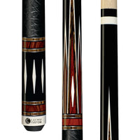 This classically-styled Lucasi Custom cue features a mystic black forearm and butt with six-point Cocobolo & Bocote inlay points bordered by imitation bone, Cocobolo, Bocote stacked rings, elephant embossed premium leather wrap, slim Implex butt cap, quick-release Uni-loc joint, and Zero Flexpoint Solid Core Low Deflection Technology Shaft.