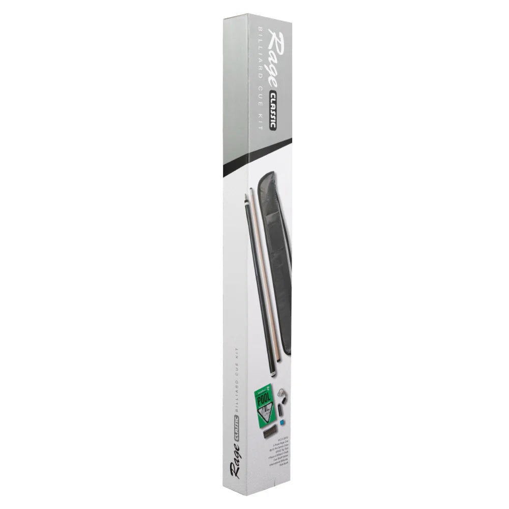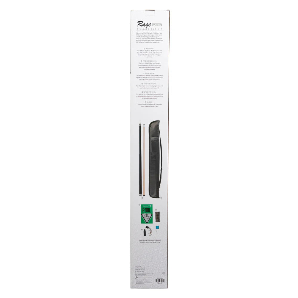The Rage Classic Billiard Cue Kit includes all the billiards essentials needed so you can be ready to face any opponent. This kit includes a 2-piece Rage Pool Cue, Pro Series Soft Cue Case (1B/1S), one piece of billiards chalk, Spike Tip Tool, Cue Shaft Slicker, and the official International Billiards Rule Book. This makes a great gift for someone looking to get started in the game.